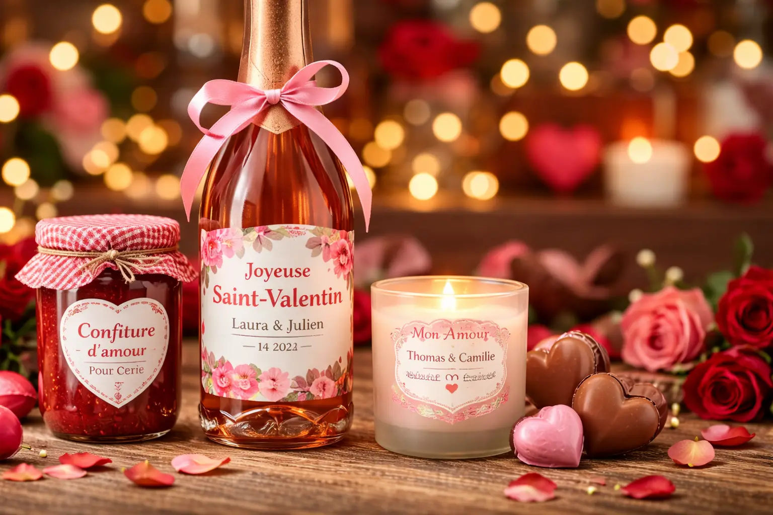 Flaschen sind ein Klassiker zum Valentinstag. Mit einer personalisierten Etikette können Sie eine „Sonderedition“ ganz nach Ihrem Geschmack kreieren.